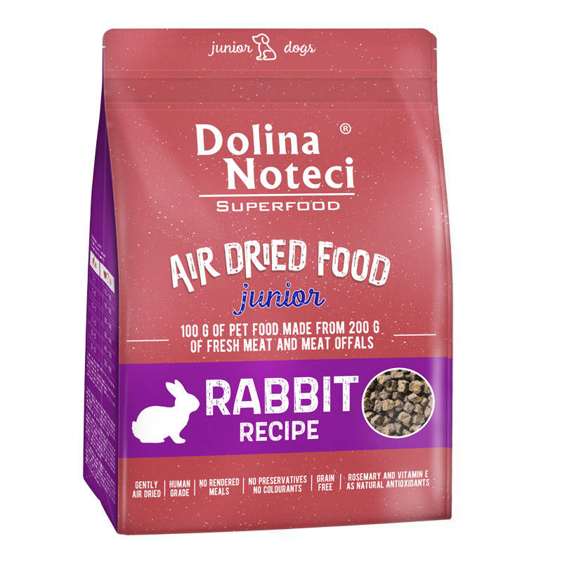 Dolina Noteci SUPERFOOD med kanin er et komplet foder beregnet hvalpe og unge hunde af mellem og store racer. Indholdet af kaninkød og -lever giver et højt indhold af protein med høj fordøjelighed. Sammensætningen af oksekød, svinekød, kalkun og lakseolie gør foderet rigt på fedtsyrer fra n-6- og n-3-familien. Friske grøntsager og frugter, er et vigtigt element i en ordentlig kost til hunden.
