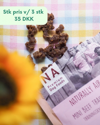 Da mængden af snacks brugt under træning ofte er høj (hvem ved det ikke), er sunde ingredienser særligt vigtige. SANADOG træningsgodbidder er lavet af rent oksekød og er raffineret med en sjat glycerin lavet af rapsolie (en fedtkomponent). Den sunde glycerin binder vand og sikrer den bløde konsistens.