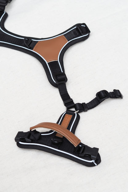 På ryggen finder du et praktisk håndtag til ekstra kontrol, samt D-ring både foran og på ryggen, så du kan vælge, hvordan linen skal fæstnes. Selen er foret med blød neopren, som føles behagelig mod pelsen (og som ikke slider pelsen) og tørrer hurtigt efter regn, strandture eller snevejr.